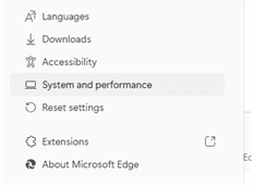- In Edge, from the ‘Settings’ menu and ‘System and performance’: