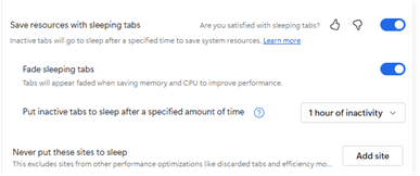 - Toggle ‘On’ setting for ‘Save resources with sleeping tabs.’