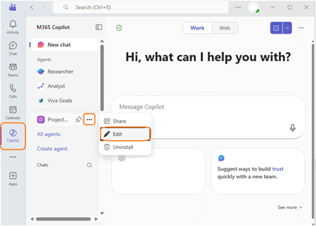 - From Copilot’s menu: select ‘…’ (Options) next to the agent you want to modify and select ‘Edit’ from the available drop-down.