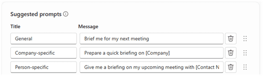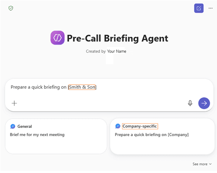 TIP: Think of agent prompts in terms of offering quick ways for you to refine your Copilot agent’s tasks. Base prompts on time, calendar dates, or context—or draft prompts that are ‘company’ or ‘person’ specific. Come up with your own!