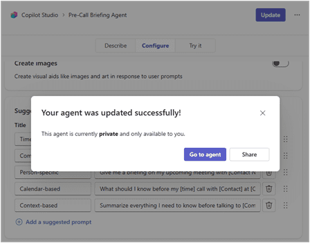 - Select ‘Update’ to update the Copilot agent.